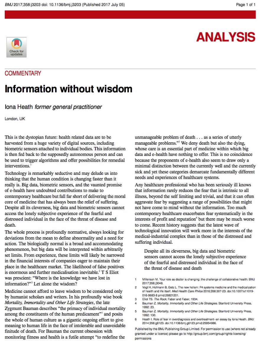 | BMJ 2017;358:j3203 Iona Heath, former general practitioner | Commentary- Information without Wisdom |